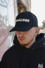 Our sporty black caps with a white design are now available and make the perfect addition to your style.